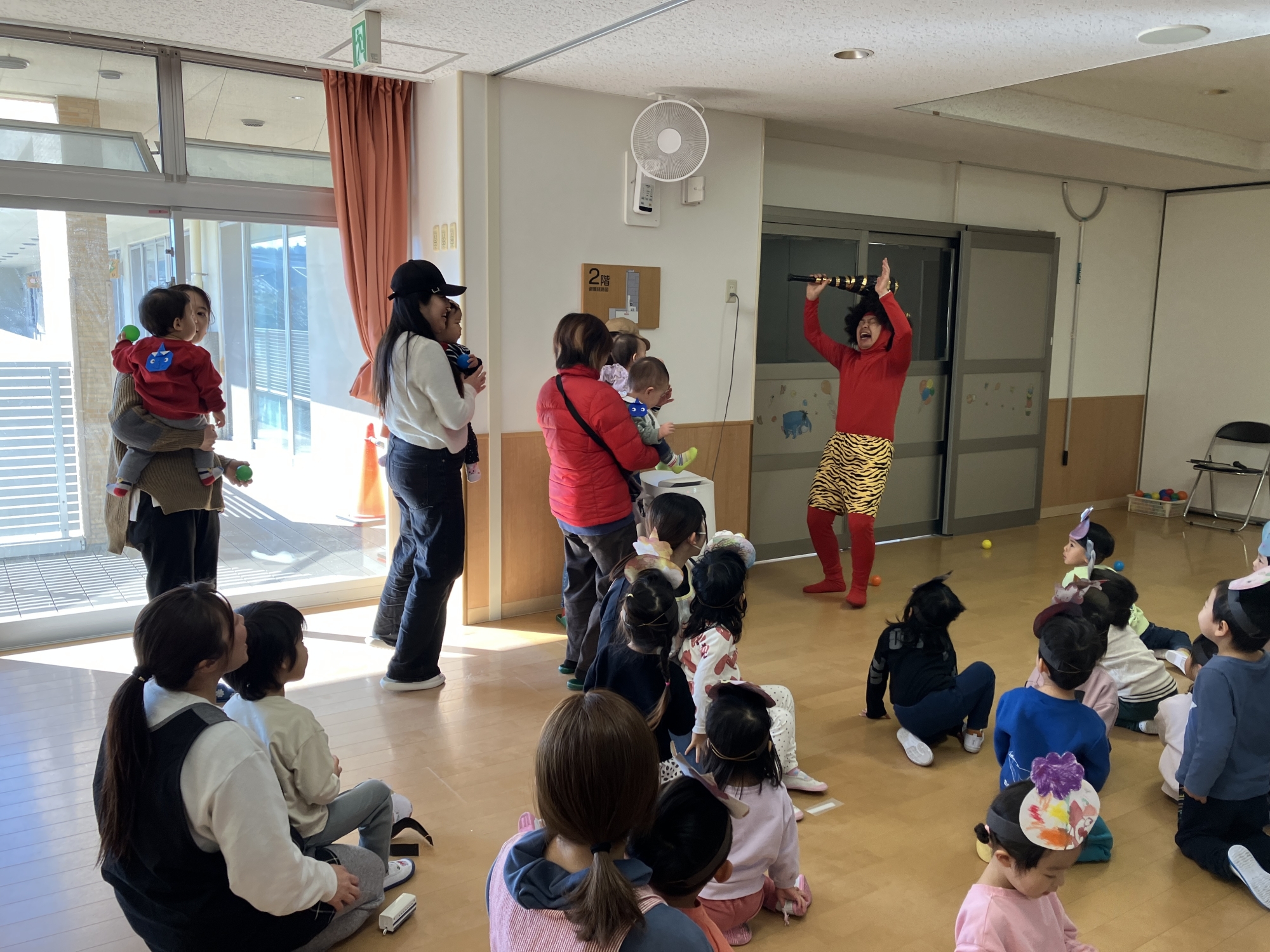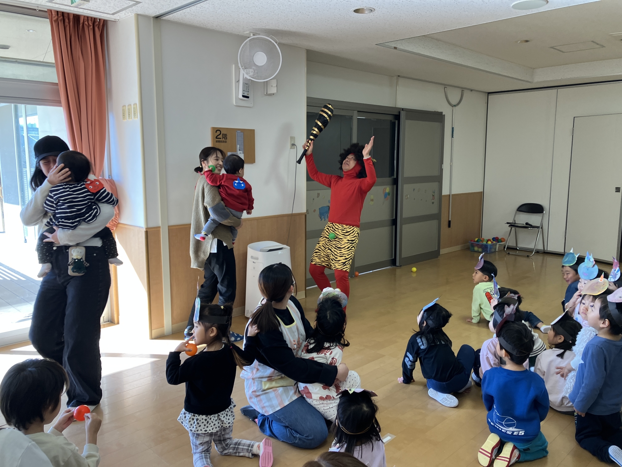 豆の代わりにカラーボールを赤鬼さんに投げました。